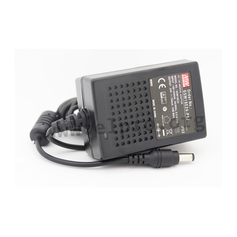 Plug-in switching power supplies in a plastic housing (UL94V-0) with 18W, a europlug, a universal input, insulation class II, energy efficiency Level V/VI, an LED indicator for power on and a low no-load power. These devices are suitable for medical technology applications (2xMOPP) and comply with EN60601-1, EN60601-1-11, EN55011 class B, EN61000-3-2 class A as well as EN61000-3-3. They have a very high reliability and are protected against overload (auto recovery), overvoltage as well as short circuit. We offer the following types of this Mean Well series: GSM18E05-P1J, GSM18E07-P1J, GSM18E09-P1J, GSM18E12-P1J, GSM18E15-P1J, GSM18E18-P1J, GSM18E24-P1J and GSM18E48-P1J.