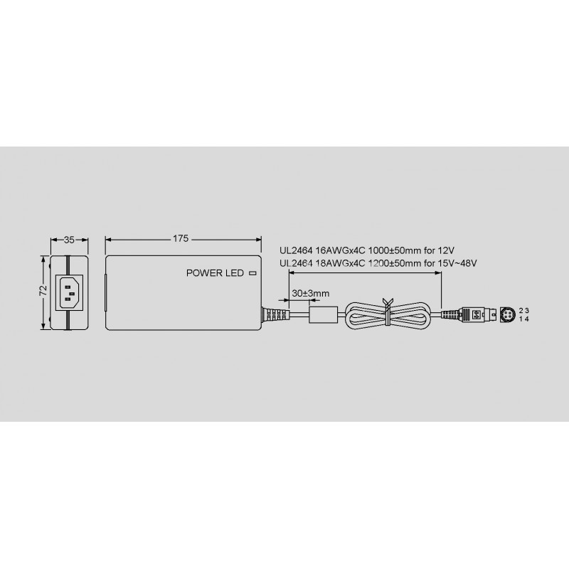 Desktop switching power supplies in a plastic housing with 160W, a universal input, a low no-load power (<0,15W), insulation class I and energy efficiency Level VI. These devices have a built-in active PFC function and are protected against overload, overtemperature, short circuit as well as overvoltage. They have an LED indicator for power on and comply with EN62368-1 as well as EN55032 class B. We offer the following types of this Mean Well series: GST160A12-R7B, GST160A15-R7B, GST160A20-R7B, GST160A24-R7B, GST160A36-R7B and GST160A48-R7B.
