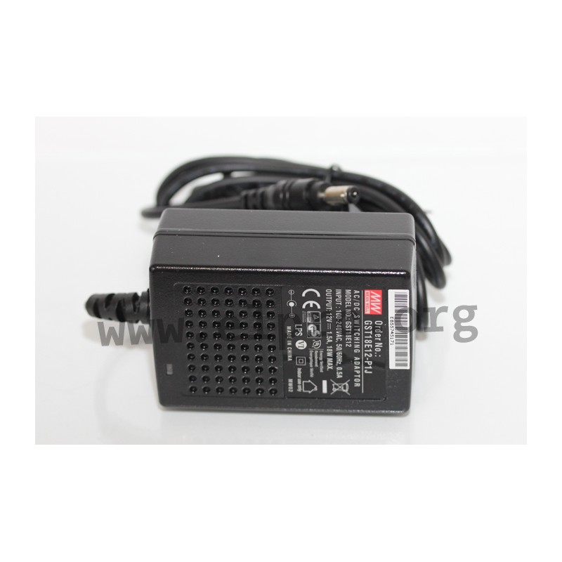 Plug-in switching power supplies in a plastic housing with 18W, a europlug, a universal input, insulation class II, energy efficiency Level VI and a low no-load power. These devices are protected against overload (auto recovery), overvoltage as well as short circuit and comply with EN62368-1, EN55032 class B, EN61000-3-2 class A as well as EN61000-3-3. We offer the following types of this Mean Well series: GST18E05-P1J, GST18E07-P1J, GST18E09-P1J, GST18E12-P1J, GST18E15-P1J, GST18E24-P1J, GST18E28-P1J and GST18E48-P1J.
