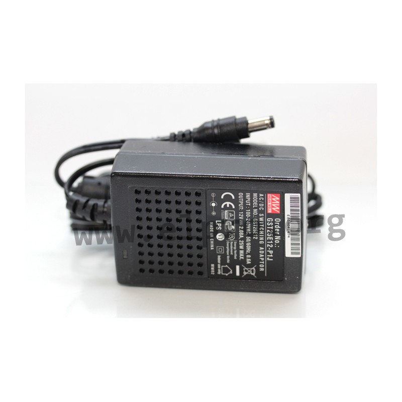 Plug-in switching power supplies in a plastic housing with 25W, a europlug, a universal input, an LED indicator for power on, a low no-load power, insulation class II and energy efficiency Level VI. These devices are protected against overload (auto recovery), overvoltage as well as short circuit and comply with EN62368-1, EN55032 class B, EN61000-3-2 class A as well as EN61000-3-3. We offer the following types of this Mean Well series: GST25E05-P1J, GST25E07-P1J, GST25E09-P1J, GST25E12-P1J, GST25E15-P1J, GST25E18-P1J, GST25E24-P1J, GST25E28-P1J and GS25E48-P1J.