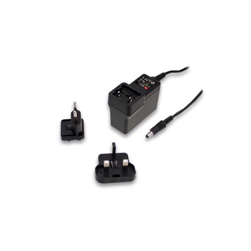 LED plug-in switching power supplies with 30W, a constant voltage, protection class II and a universal input. These devices have a built-in active PFC function and are protected against overload (auto recovery). They are suitable for LED lighting applications, have interchangeable input plugs and comply with EN61347-1. We offer the following types of this Mean Well series: GSV30I12-P1J, GSV30I24-P1J and GSV30I48-P1J.