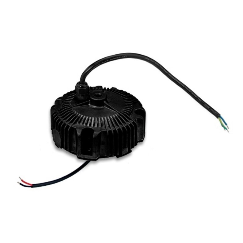 LED drivers in a circular metal case (IP67) with a constant current (pre-set), 160W and a wide input range. These devices comply with EN61347-1, EN61347-2-13, EN55015, EN61000-3-2 class C, EN61000-3-3 as well as EN61547 and are protected against short circuit, overload (auto recovery), overvoltage as well as overtemperature. They are suitable for LED lighting applications and have a built-in active PFC function. We offer the following types of this Mean Well series: HBG-160-24, HBG-160-36, HBG-160-48 and HBG-160-60.