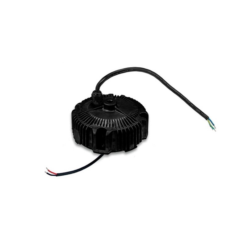 LED drivers in a circular metal housing (IP65) with 160W, a constant current/voltage and a 3 in 1 dimming function. These SELV compliant devices have a built-in active PFC function, a potentiometer for adjusting the current limiting and are protected against overload, overtemperature, overvoltage as well as short circuit. They are suitable for LED lighting applications and comply with EN61347-1, EN61347-2-13, EN55015, EN61000-3-2 class C, EN61000-3-3 as well as EN61547. We offer the following types of this Mean Well series: HBG-160-24AB, HBG-160-36AB, HBG-160-48AB and HBG-160-60AB.