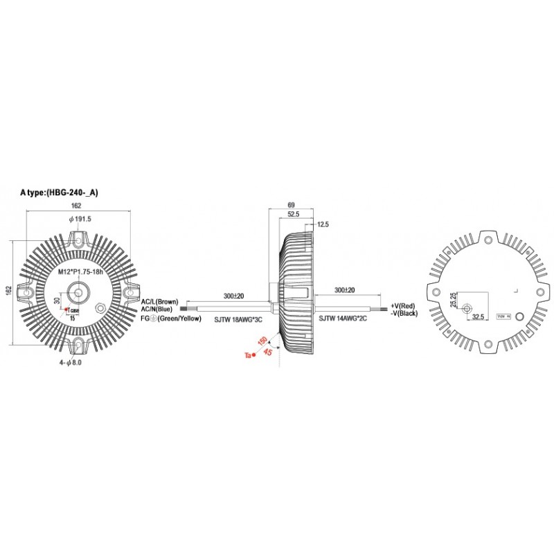 LED drivers in a metal housing (IP65, circular shape) with a constant power, a built-in potentiometer for adjusting the current limitation, 240W and a constant current. These SELV compliant devices are protected against overload (auto recovery), overtemperature, short circuit as well as overvoltage and are suitable for LED lighting applications. They comply with EN55015, EN61000-3-3, EN61000-3-2 class C, EN61547, EN61347-2-13 as well as EN61347-1 and have a built-in active PFC function. We offer the following types of this Mean Well series: HBG-240-48A and HBG-240-60A.