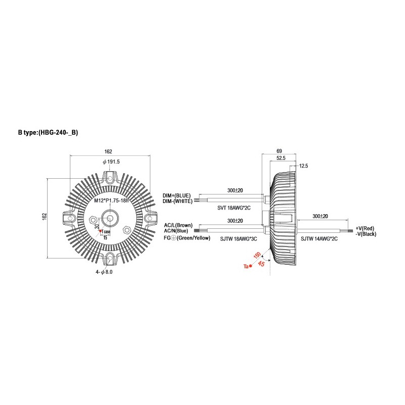 LED drivers in a metal housing (IP67, circular shape) with a 3 in 1 dimming function (1 to 10V DC, PWM, 100kOhm potentiometer), a constant power, 240W and a constant current. These SELV compliant devices are suitable for LED lighting applications and comply with EN61347-2-13, EN61347-1, EN61547, EN55015, EN61000-3-2 class C as well as EN61000-3-3. They are protected against overload (auto recovery), overtemperature, short circuit as well as overvoltage and have a built-in active PFC function. We offer the following types of this Mean Well series: HBG-240-24B, HBG-240-36B, HBG-240-48B and HBG-240-60B.