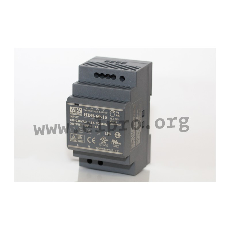 Switching power supplies in a slim housing (52,5mm width) with 60W, a universal input, insulation class II, an LED indicator for power on, a low no-load power and screw terminals (touch guard). These devices are suitable for DIN rail mounting and are protected against overload (auto recovery), overvoltage as well as short circuit. They have an adjustable DC output voltage as well as a fanless design and comply with UL/EN62368-1, EN61558-2-16, EN61558-1, EN55032 class B, EN61000-3-2 as well as EN61000-3-3. We offer the following types of this Mean Well series: HDR-60-5, HDR-60-12, HDR-60-15, HDR-60-24 and HDR-60-48.