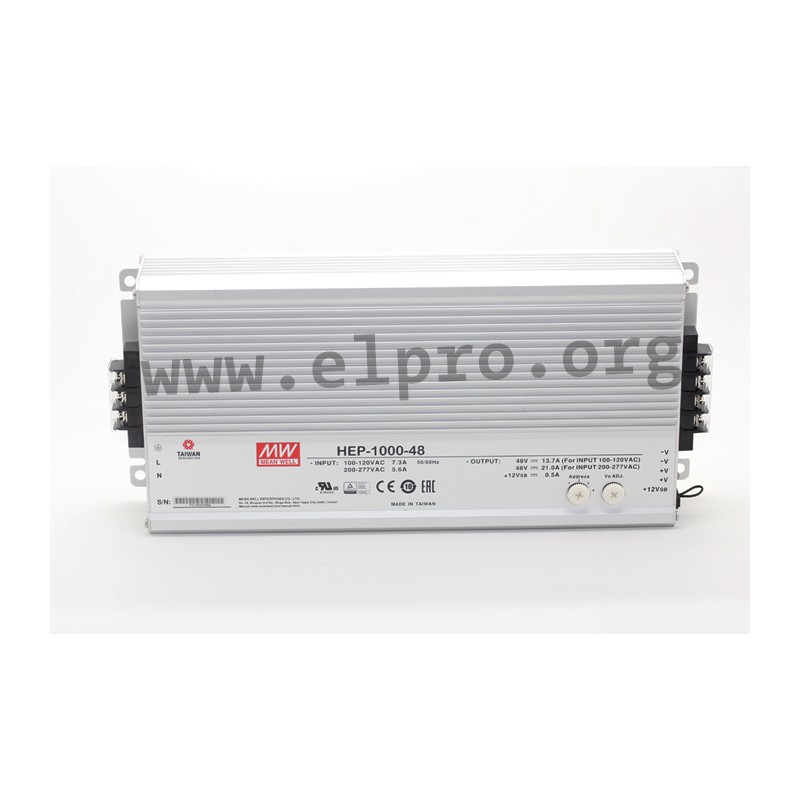 Switching power supplies in an aluminium housing with 1000W, a CAN bus interface, a DC OK signal and a universal input. These devices have a built-in active PFC function, are suitable for harsh environments and are protected against overload, overtemperature, overvoltage as well as short circuit. They have a programmable output voltage/current and comply with EN62368-1 as well as EN55032 class B. We offer the following types of this Mean Well series: HEP-1000-24CAN, HEP-1000-48CAN and HEP-1000-100CAN.