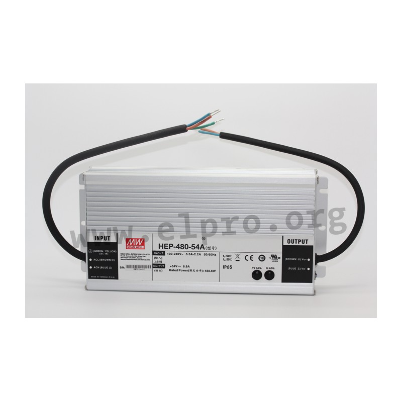 Switching power supplies in an enclosed aluminium housing (IP65) with 480W, a universal input, screw terminals and a surge immunity level of 6kV. These devices have a built-in active PFC function and are protected against overload (auto recovery), overvoltage as well as short circuit. They are suitable for harsh environments and comply with EN61000-3-2, EN61000-3-3, EN60950-1 as well as EN55032. We offer the following types of this Mean Well series: HEP-480-24A, HEP-480-36A, HEP-480-48A and HEP-480-54A.