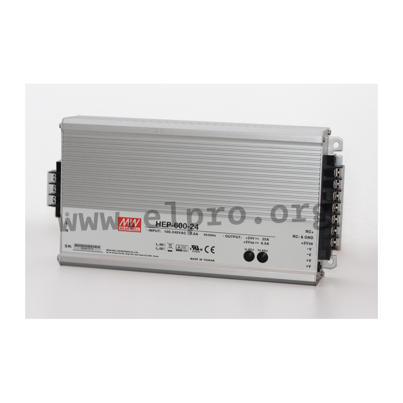 Switching power supplies in an enclosed aluminium case with 600W, screw terminals, a built-in remote ON/OFF control, a universal input, a built-in auxiliary power (stand-by 5V/0,5A) and a low no-load power consumption (<0,5W). These devices have a built-in active PFC function and are protected against short circuit, overload (auto recovery) as well as overvoltage. They are suitable for harsh environments and comply with EN60950, EN55032 class B as well as EN61000-3-2. We offer the following types of this Mean Well series: HEP-600-12, HEP-600-15, HEP-600-24, HEP-600-30, HEP-600-36, HEP-600-42, HEP-600-48 and HEP-600-54.