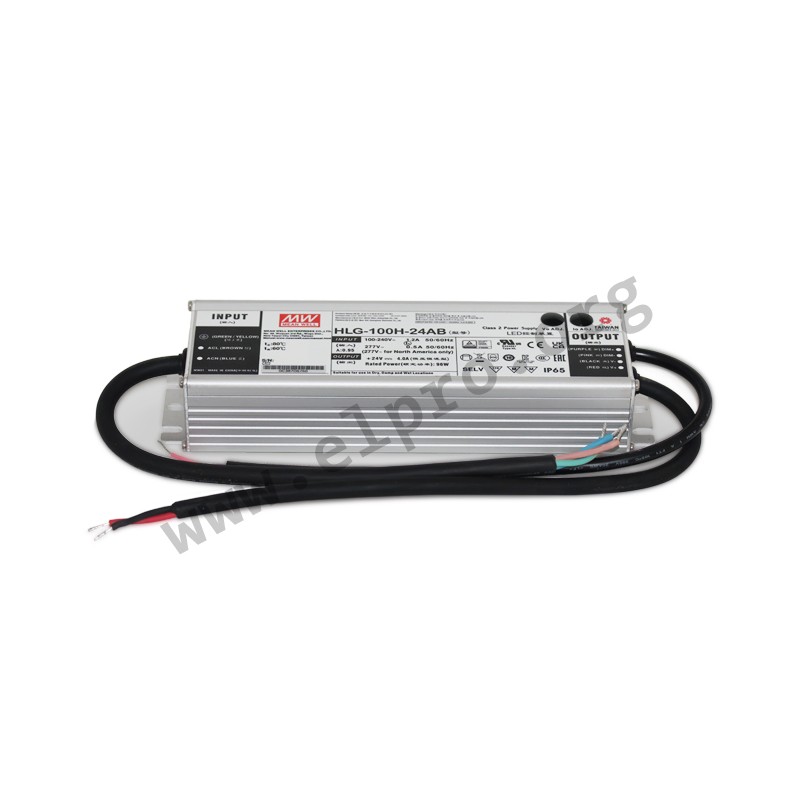 LED drivers in a metal case (IP65) with a constant current, a wide input range and 96W. These SELV compliant devices are protected against short circuit, overload (auto recovery), overvoltage as well as overtemperature and have a built-in potentiometer for adjusting the output current as well as a built-in active PFC function. They comply with EN61347-1, EN61347-2-13, EN55015, EN61000-3-2 class C, EN61000-3-3 as well as EN61547, are suitable for LED lighting applications and have a 3 in 1 dimming function (1 to 10V DC, 10V PWM). We offer the following types of this Mean Well series: HLG-100H-20AB, HLG-100H-24AB, HLG-100H-30AB, HLG-100H-36AB, HLG-100H-42AB, HLG-100H-48AB and HLG-100H-54AB.
