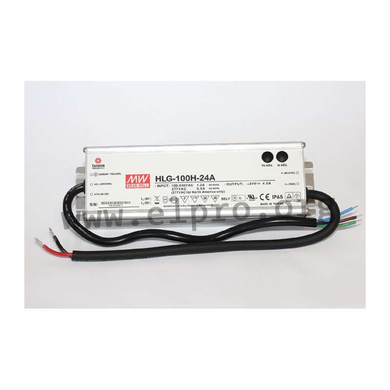 LED drivers in a metal housing (IP65) with a constant current / constant voltage (mixed mode) and 100W. These SELV compliant devices comply with EN61347-1, EN61347-2-13, EN55015, EN61000-3-2 class C, EN61000-3-3 as well as EN61547 and are protected against overload (auto recovery), overtemperature, overvoltage as well as short circuit. They are not dimmable and are suitable for LED lighting applications. We offer the following types of this Mean Well series: HLG-100H-20A, HLG-100H-24A, HLG-100H-30A, HLG-100H-36A, HLG-100H-42A, HLG-100H-48A and HLG-100H-54A.