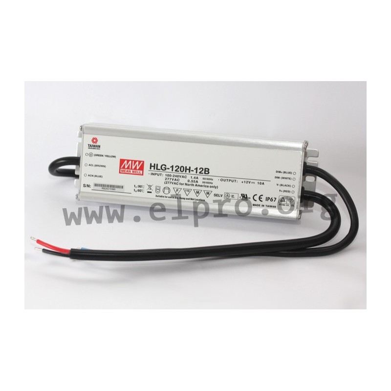 LED drivers in a metal housing (IP67) with a 3 in 1 dimming function (1 to 10V DC, PWM, 100kOhm potentiometer), a constant current / constant voltage (mixed mode) and 120W. These SELV compliant devices are protected against overload (auto recovery), overtemperature, short circuit as well as overvoltage and are suitable for LED lighting applications. They comply with EN61347-1, EN61347-2-13, EN55015, EN61000-3-2 class C, EN61000-3-3 as well as EN61547 and have a built-in active PFC function. We offer the following types of this Mean Well series: HLG-120H-12B, HLG-120H-15B, HLG-120H-20B, HLG-120H-24B, HLG-120H-30B, HLG-120H-36B, HLG-120H-42B, HLG-120H-48B and HLG-120H-54B.