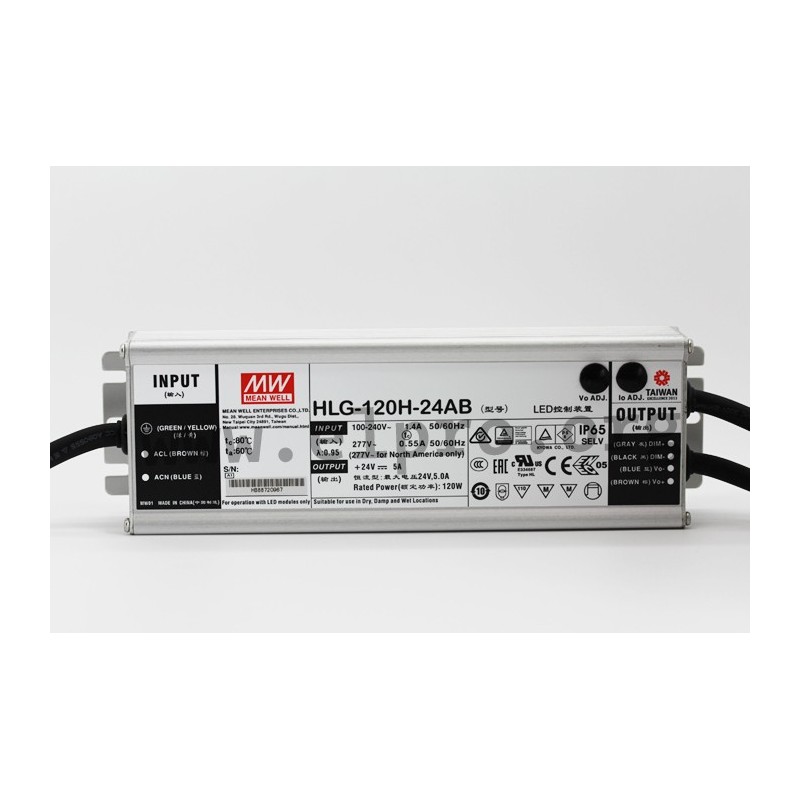 LED drivers in a metal housing (IP65) with a constant voltage (CC/CV mixed mode), a 3 in 1 dimming function (1 to 10V DC, PWM, 100kOhm potentiometer), 120W and a wide input range. These SELV compliant devices are protected against overload (auto recovery), overtemperature, short circuit as well as overvoltage, are suitable for LED lighting applications and comply with EN61347-1, EN61347-2-13, EN55015, EN61000-3-2 Klasse C, EN61000-3-3 as well as EN61547. They have a built-in active PFC function, a built-in potentiometer for adjusting the output voltage as well as the current limitation as well as a constant current (CC/CV mixed mode). We offer the following types of this Mean Well series: HLG-120H-12AB, HLG-120H-15AB, HLG-120H-20AB, HLG-120H-24AB, HLG-120H-30AB, HLG-120H-36AB, HLG-120H-42AB, HLG-120H-48AB and HLG-120H-54AB.