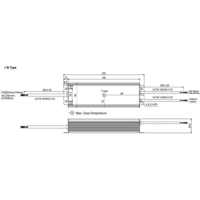 LED drivers in a metal housing (IP67) with a 3 in 1 dimming function (1 to 10V DC, PWM, 100kOhm potentiometer), a constant current / constant voltage (mixed mode) and 120W. These SELV compliant devices are protected against overload (auto recovery), overtemperature, short circuit as well as overvoltage and are suitable for LED lighting applications. They comply with EN61347-1, EN61347-2-13, EN55015, EN61000-3-2 class C, EN61000-3-3 as well as EN61547 and have a built-in active PFC function. We offer the following types of this Mean Well series: HLG-120H-12B, HLG-120H-15B, HLG-120H-20B, HLG-120H-24B, HLG-120H-30B, HLG-120H-36B, HLG-120H-42B, HLG-120H-48B and HLG-120H-54B.