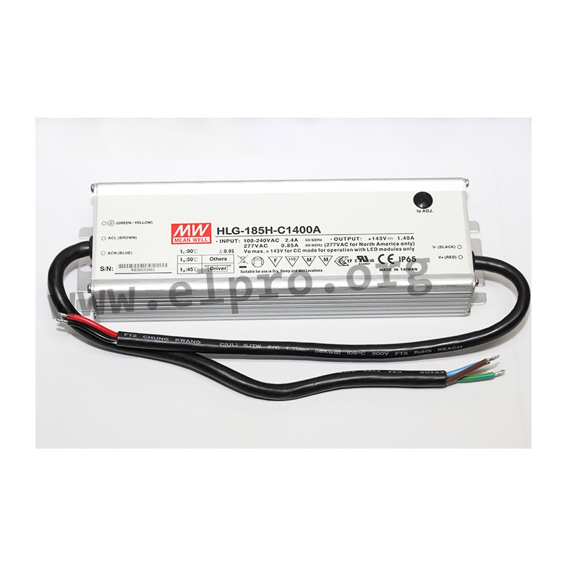 LED drivers in a metal housing (IP65) with a constant current, a built-in potentiometer for adjusting the current limitation and a high output voltage. These devices are suitable for LED lighting applications, are not dimmable and have a built-in active PFC function. They comply with EN55015, EN61000-3-2 class C, EN61000-3-3 as well as EN61547 and are protected against overload (auto recovery), overtemperature, short circuit as well as overvoltage. We offer the following types of this Mean Well series: HLG-185H-C500A, HLG-185H-C700A, HLG-185H-C1050A and HLG-185H-C1400A.