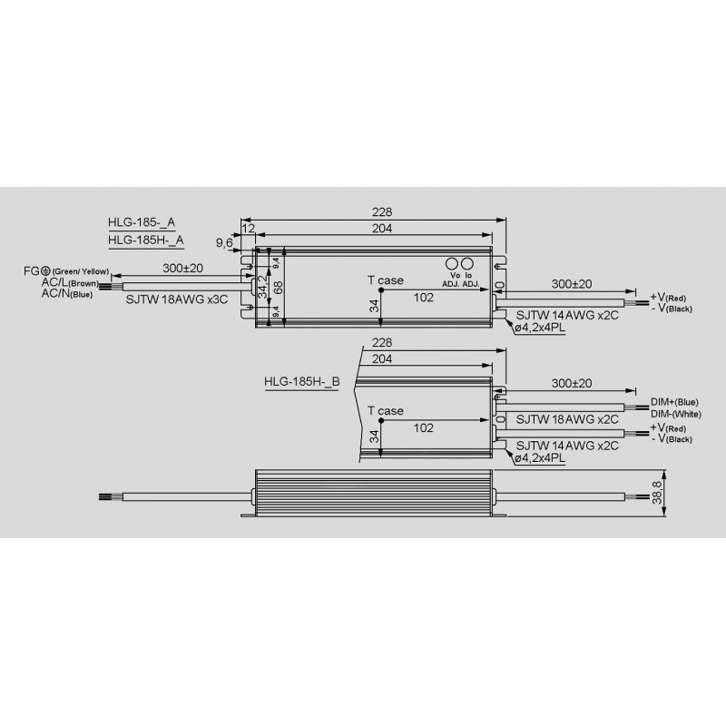 LED drivers in a metal housing (IP67) with a constant voltage, a 3 in 1 dimming function (1 to 10V DC, PWM, 100kOhm potentiometer), 185W and a constant current. These SELV compliant devices comply with EN61347-1, EN61347-2-13, EN55015 as well as EN61000-3-2 class C and are suitable for LED lighting applications. They have a built-in active PFC function and are protected against overload (auto recovery), short circuit, overtemperature as well as overvoltage. We offer the following types of this Mean Well series: HLG-185H-12B, HLG-185H-15B, HLG-185H-20B, HLG-185H-24B, HLG-185H-30B, HLG-185H-36B, HLG-185H-48B and HLG-185H-54B.