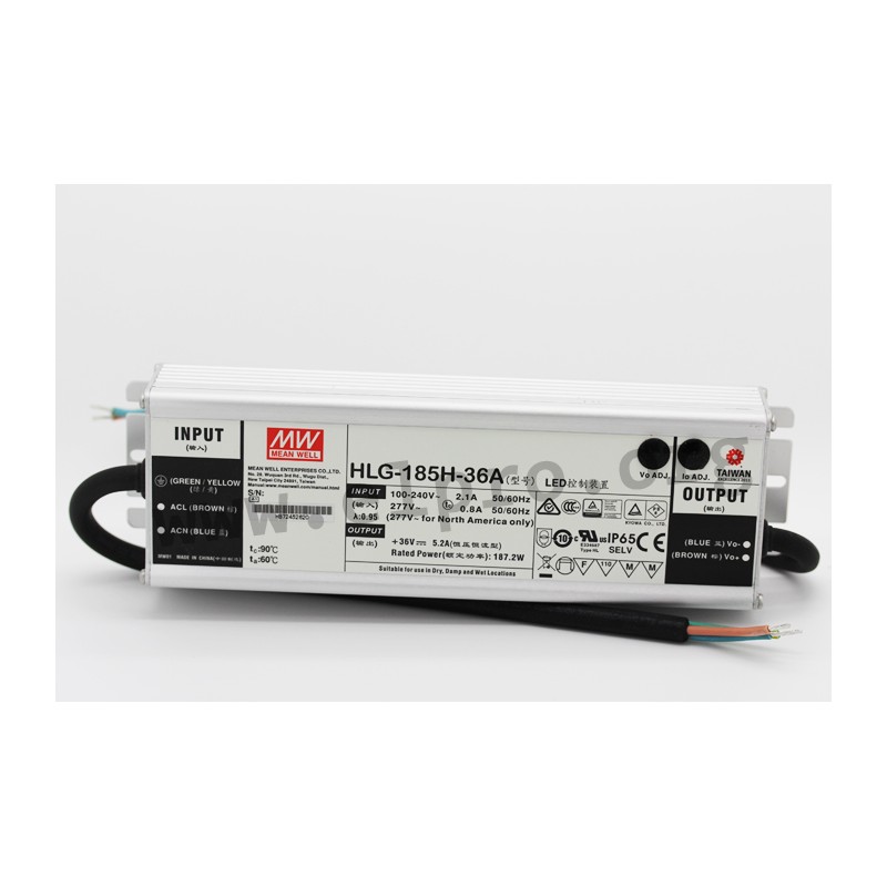 LED drivers in a metal housing (IP65) with a constant current, 185W and a constant voltage. These SELV compliant devices comply with EN61347-1, EN61347-2-13, EN55015 as well as EN61000-3-2 class C, are suitable for LED lighting applications and are not dimmable. They have a built-in potentiometer for adjusting the current limitation / output voltage as well as a built-in active PFC function and are protected against overload (auto recovery), overtemperature, short circuit as well as overvoltage. We offer the following types of this Mean Well series: HLG-185H-12A, HLG-185H-15A, HLG-185H-20A, HLG-185H-24A, HLG-185H-30A, HLG-185H-36A, HLG-185H-42A, HLG-185H-48A and HLG-185H-54A.