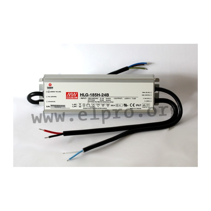 LED drivers in a metal housing (IP67) with a constant voltage, a 3 in 1 dimming function (1 to 10V DC, PWM, 100kOhm potentiometer), 185W and a constant current. These SELV compliant devices comply with EN61347-1, EN61347-2-13, EN55015 as well as EN61000-3-2 class C and are suitable for LED lighting applications. They have a built-in active PFC function and are protected against overload (auto recovery), short circuit, overtemperature as well as overvoltage. We offer the following types of this Mean Well series: HLG-185H-12B, HLG-185H-15B, HLG-185H-20B, HLG-185H-24B, HLG-185H-30B, HLG-185H-36B, HLG-185H-48B and HLG-185H-54B.