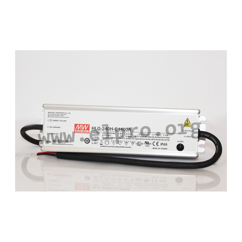LED drivers in a metal housing (IP65) with a built-in potentiometer for adjusting the current limitation, a constant current and 240W. These devices comply with EN61347-1, EN61347-2-13, EN55015 as well as EN61000-3-2 class C and are suitable for LED lighting applications. They are protected against overload (auto recovery), overtemperature, short circuit as well as overvoltage, are not dimmable and have a built-in active PFC function. We offer the following types of this Mean Well series: HLG-240H-C700A, HLG-240H-C1050A, HLG-240H-C1400A, HLG-240H-C1750A and HLG-240H-C2100A.