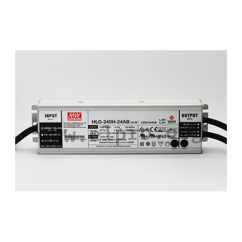 LED drivers in a metal case (IP65) with a built-in active PFC function as well as a constant voltage. These SELV compliant devices are protected against overtemperature, overvoltage, overcurrent, short-circuit and overload through constant current limiting (auto recovery) and are suitable for LED lighting applications. The output voltage and current are adjustable through a built-in potentiometer and are in compliance to the EMC standards EN 55015, EN 61000-3-2 Class C, EN 61000-3-3 and EN 61547 as well to the safety standards EN 61347-1 and EN 61347-2-13. Furthermore, they have a 3 in 1 dimming function (1 to 10V DC, potentiometer, PWM) and are in compliance to the EMC standards EN 55015, EN 61000-3-2 Class C, EN 61000-3-3 and EN 61547 as well to the safety standards EN 61347-1 and EN 61347-2-13. We offer the following types of this Mean Well series: HLG-240H-12AB, HLG-240H-15AB, HLG-240H-20AB, HLG-240H-24AB, HLG-240H-30AB, HLG-240H-36AB, HLG-240H-42AB, HLG-240H-48AB and HLG-240H-54AB.