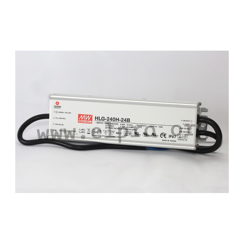 LED drivers in a metal housing (IP67) with a power output of 240W and constant current / constant voltage. These devices comply with SELV regulations and include an active PFC function as well as protection against overload (with auto recovery), overtemperature, overvoltage and short circuits. They are suitable for use in LED lighting applications that require lead-out control for dimming purposes while adhering to EN61347-1, EN61347-2-13,and EN50155 standards along with those set by EN61000-3-2 Class C or higher levels; additionally they meet the requirements specified under both the EN61000-3-3 standard as well as those outlined within the guidelines established by EN61547. We offer the following types of this Mean Well series: HLG-240H-12B, HLG-240H-15B, HLG-240H-20B, HLG-240H-24B, HLG-240H-30B, HLG-240H-36B, HLG-240H-42B, HLG-240H-48B and HLG-240H-54B.