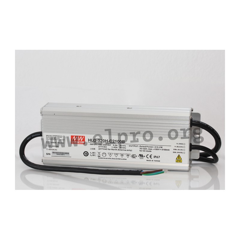 LED drivers in a metal housing (IP67) with a 3 in 1 dimming function (0 to 10V DC, 10V PWM, resistor), a long service life (>62.000h) and a constant voltage. These devices are protected against overload (auto recovery), overtemperature, short circuit as well as overvoltage and comply with EN61347-1, EN55015, EN61347-2-13 as well as EN61000-3-2 class C. They are suitable for LED lighting applications and have a built-in active PFC function. We offer the following types of this Mean Well series: HLG-320H-C700B, HLG-320H-C1050B, HLG-320H-C1400B, HLG-320H-C1750B, HLG-320H-C2100B, HLG-320H-C2800B and HLG-320H-C3500B.