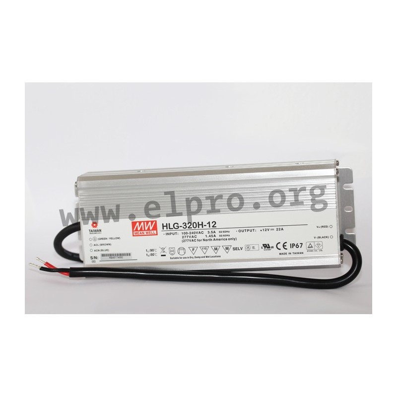 LED drivers in a metal housing (IP67) with a constant voltage, 320W and a constant current. These SELV compliant devices are protected against overload (auto recovery), short circuit, overtemperature as well as overvoltage, are suitable for LED lighting applications and are not dimmable. They comply with EN61347-2-13, EN61347-1, EN61000-3-3, EN55015, EN61547 as well as EN61000-3-2 class C and have a built-in active PFC function. We offer the following types of this Mean Well series: HLG-320H-12, HLG-320H-15, HLG-320H-20, HLG-320H-24, HLG-320H-30, HLG-320H-36, HLG-320H-42, HLG-320H-48 and HLG-320H-54.