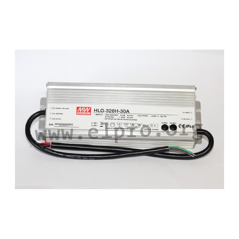 LED drivers in a metal housing (IP65) with a constant voltage, 320W and a built-in potentiometer for adjusting the current limitation / output voltage. These SELV compliant devices are protected against overload (auto recovery), overtemperature, short circuit as well as overvoltage, are suitable for LED lighting applications and are not dimmable. They comply with EN61347-1, EN61347-2-13, EN61547, EN55015, EN61000-3-3 as well as EN61000-3-2 class C and have a built-in active PFC function. We offer the following types of this Mean Well series: HLG-320H-12A, HLG-320H-15A, HLG-320H-20A, HLG-320H-24A, HLG-320H-30A, HLG-320H-36A, HLG-320H-42A, HLG-320H-48A and HLG-320H-54A.