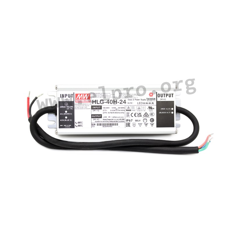 LED drivers in a metal housing (IP67) with a constant current/constant voltage (fixed preset), a wide input range and 40W. These SELV compliant devices are suitable for LED lighting applications and are protected against overload (auto recovery), overvoltage, overtemperature as well as short circuit. They comply with EN61347-1, EN61347-2-13, EN55015, EN61000-3-2 class C, EN61000-3-3 as well as EN61547 and have a built-in active PFC function. We offer the following types of this Mean Well series: HLG-40H-12, HLG-40H-15, HLG-40H-20, HLG-40H-24, HLG-40H-30, HLG-40H-36, HLG-40H-42, HLG-40H-48 and HLG-40H-54.