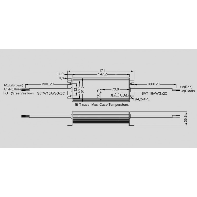 LED drivers in a metal housing (IP65) with a built-in active PFC function as well as a built-in potentiometer for adjusting the output voltage / current limitation. These devices are protected against overload (auto recovery), overtemperature, overvoltage as well as short circuit and comply with EN61347-1, EN61347-2-13, EN55015, EN61000-3-2 class C, EN61000-3-3 as well as EN61547. We offer the following types of this Mean Well series: HLG-40H-12A, HLG-40H-15A, HLG-40H-20A, HLG-40H-24A, HLG-40H-30A, HLG-40H-36A, HLG-40H-42A, HLG-40H-48A and HLG-40H-54A.