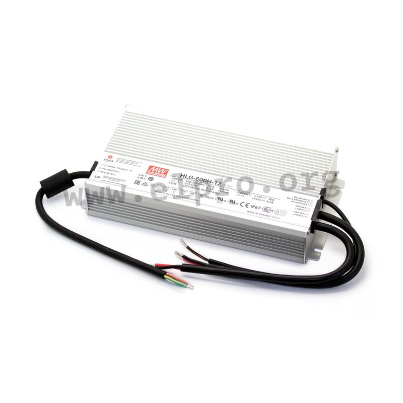 LED drivers in a metal case (IP67) with a constant current/constant voltage, a wide input range, 600W and a typical lifetime of more than 62.000 hours. These SELV compliant devices comply with EN61347-1, EN61347-2-13, EN55015, EN61000-3-2 class C, EN61000-3-3 as well as EN61547 and are suitable for LED lighting applications. They are protected against short circuit, overload (auto recovery), overvoltage as well as overtemperature and have a built-in active PFC function. We offer the following types of this Mean Well series: HLG-600H-12, HLG-600H-15, HLG-600H-20, HLG-600H-24, HLG-600H-30, HLG-600H-36, HLG-600H-42, HLG-600H-48 and HLG-600H-54.