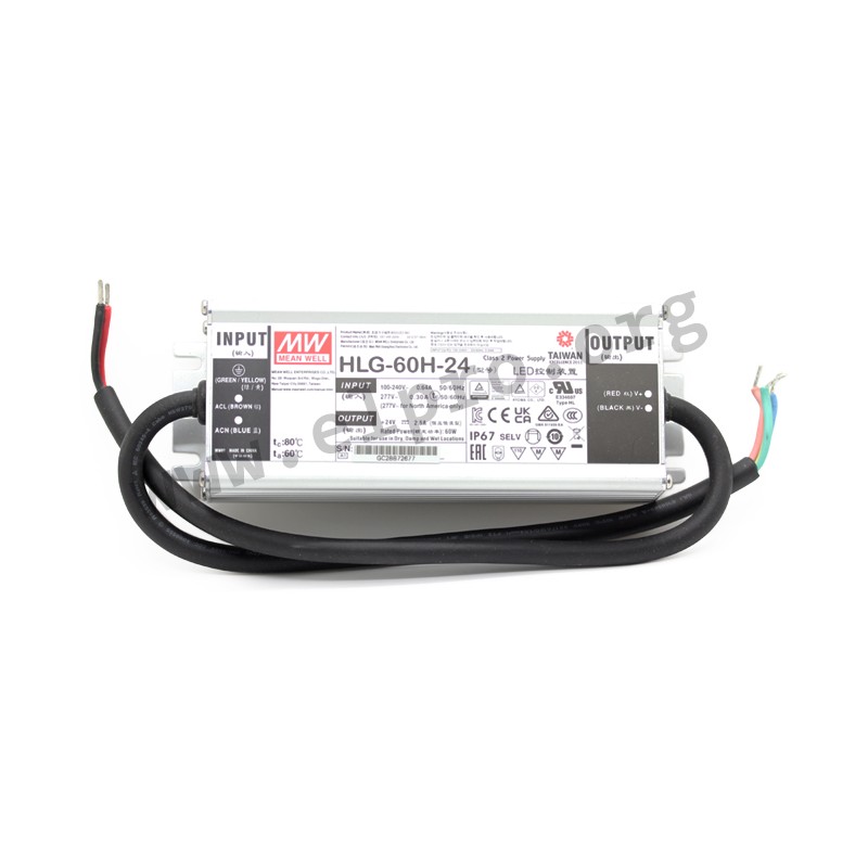 LED drivers in a metal housing (IP67) with a constant current/constant voltage (CC/CV, fixed preset), a wide input range and 60W. These SELV compliant devices comply with EN61347-1, EN61347-2-13, EN55015 as well as EN61000-3-2 class C and are suitable for LED lighting applications. They are protected against short circuit, overload (auto recovery), overvoltage as well as overtemperature and have a built-in active PFC function. We offer the following types of this Mean Well series: HLG-60H-15, HLG-60H-20, HLG-60H-24, HLG-60H-30, HLG-60H-36, HLG-60H-42, HLG-60H-48 and HLG-60H-54.