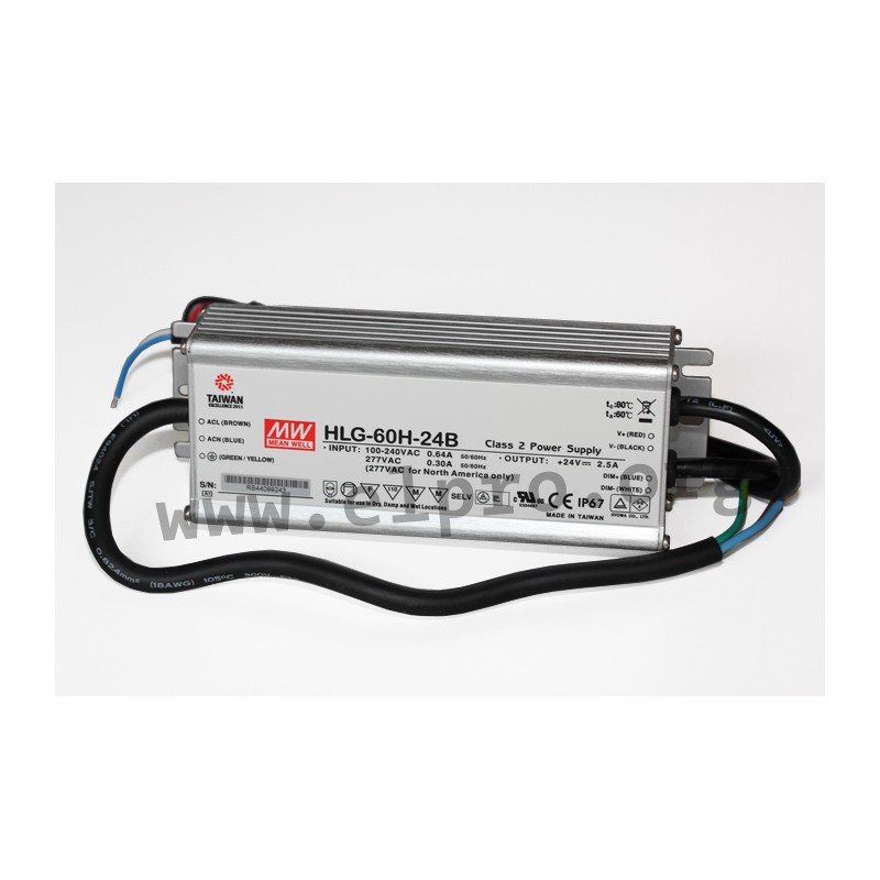 LED drivers in a metal housing (IP67) with a wide input range, 60W, a 3 in 1 dimming function (1 to 10V DC, PWM, 100kOhm potentiometer) and a constant current. These SELV compliant devices are protected against short circuit, overload (auto recovery), overvoltage as well as overtemperature and comply with EN61347-1, EN61347-2-13, EN55015 as well as EN61000-3-2 class C. They are suitable for LED lighting applications and have a built-in active PFC function. We offer the following types of this Mean Well series: HLG-60H-15B, HLG-60H-20B, HLG-60H-24B, HLG-60H-30B, HLG-60H-36B, HLG-60H-42B, HLG-60H-48B and HLG-60H-54B.
