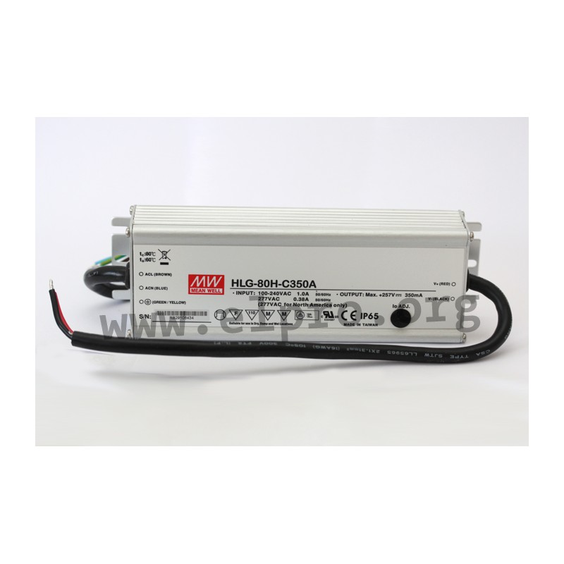LED drivers in a metal housing (IP65) with a constant current, a universal input and 90W. These devices are protected against overload (auto recovery), overvoltage as well as short circuit and comply with EN61000-3-2 class C, EN55015, EN61347-1 as well as EN61347-2-13. They have a built-in active PFC function as well as a built-in potentiometer for adjusting the current limitation and are suitable for LED lighting applications. We offer the following types of this Mean Well series: HLG-80H-C350A and HLG-80H-C700A.