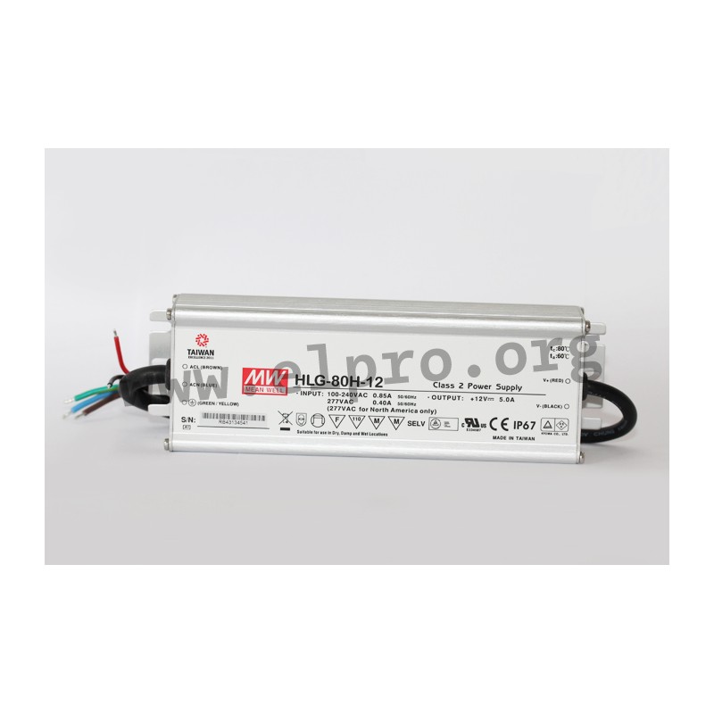 LED drivers in an aluminium housing (IP67) with a constant current, a constant voltage, 80W and a wide input range. These SELV compliant devices are protected against short circuit, overload (auto recovery), overvoltage as well as overtemperature and comply with EN61347-1, EN61347-2-13, EN55015 as well as EN61000-3-2 class C. They are suitable for LED lighting applications and have a built-in active PFC function. We offer the following types of this Mean Well series: HLG-80H-12, HLG-80H-15, HLG-80H-20, HLG-80H-24, HLG-80H-30, HLG-80H-36, HLG-80H-42, HLG-80H-48 and HLG-80H-54.