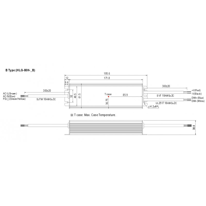 LED drivers in an aluminium housing (IP67) with a constant current, 80W and a 3 in 1 dimming function (1 to 10V DC, PWM, 100kOhm potentiometer). These SELV compliant devices are protected against short circuit, overload (auto recovery), overvoltage as well as overtemperature, are suitable for LED lighting applications and are dimmable by an executed control line. They comply with EN61347-1, EN61347-2-13, EN55015 as well as EN61000-3-2 class C and have a built-in active PFC function. We offer the following types of this Mean Well series: HLG-80H-12B, HLG-80H-15B, HLG-80H-20B, HLG-80H-24B, HLG-80H-30B, HLG-80H-36B, HLG-80H-42B, HLG-80H-48B and HLG-80H-54B.