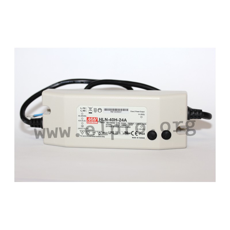 LED drivers in a plastic housing (IP64) with a constant voltage, 40W and a universal input. These devices are protected against overload (auto recovery), short circuit as well as overvoltage and are suitable for LED lighting applications. They have a built-in active PFC function as well as a built-in potentiometer for adjusting the current limitation and are not dimmable. We offer the following types of this Mean Well series: HLN-40H-12A, HLN-40H-15A, HLN-40H-20A, HLN-40H-24A, HLN-40H-30A, HLN-40H-36A, HLN-40H-42A, HLN-40H-48A and HLN-40H-54A.