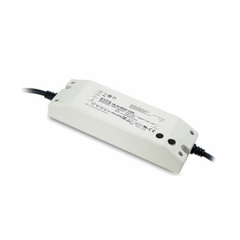 LED drivers in a plastic housing (IP64) with a constant current, 80W and a universal input. These devices are protected against overload (auto recovery), overvoltage as well as short circuit and comply with EN61347-1, EN61347-2-12, EN55015 as well as EN61000-3-2 class C. They are suitable for LED lighting applications and have a built-in active PFC function. The output current is adjustable through a 3 in 1 dimming function (1 to 10V DC, 10V PWM, resistance). We offer the type HLN-80H-36B of this Mean Well series.