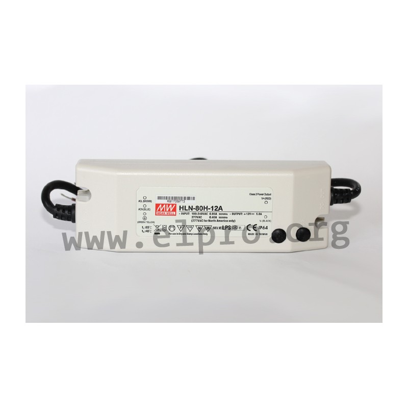 LED drivers in a plastic housing (IP64) with a constant current / constant voltage (mixed mode), 80W and a universal input. These devices are protected against overload (auto recovery), overvoltage as well as short circuit, are suitable for LED lighting applications and are not dimmable. They comply with EN61347-1, EN61347-2-13, EN55015 as well as EN61000-3-2 class C and have a built-in active PFC function. We offer the following types of this Mean Well series: HLN-80H-12A, HLN-80H-15A, HLN-80H-20A, HLN-80H-24A, HLN-80H-30A, HLN-80H-36A, HLN-80H-42A, HLN-80H-48A and HLN-80H-54A.