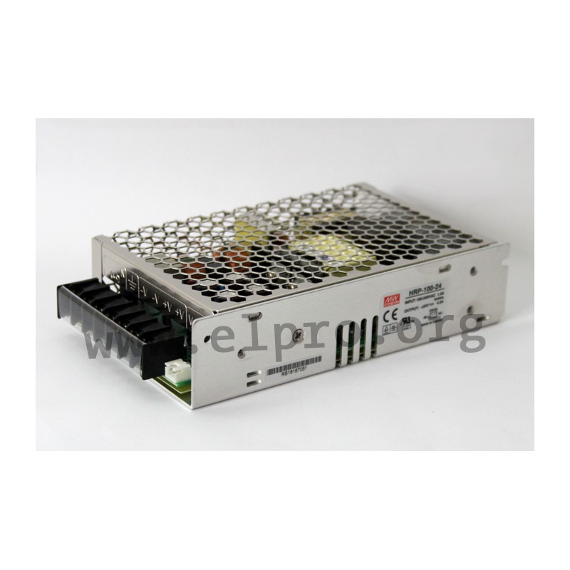 Switching power supplies in an enclosed housing with 100W, a universal input, screw terminals, a low profile and a low no-load power. These devices are using 105°C long life electrolytic capacitors and are protected against overload (auto recovery), overvoltage (300V AC / 5s) as well as short circuit. They have a built-in remote ON/OFF control and comply with UL/EN62368-1, EN55032 class B, EN61000-3-2 as well as EN61000-3-3. We offer the following types of this Mean Well series: HRP-100-3.3, HRP-100-5, HRP-100-7.5, HRP-100-12, HRP-100-15, HRP-100-24, HRP-100-36 and HRP-100-48.