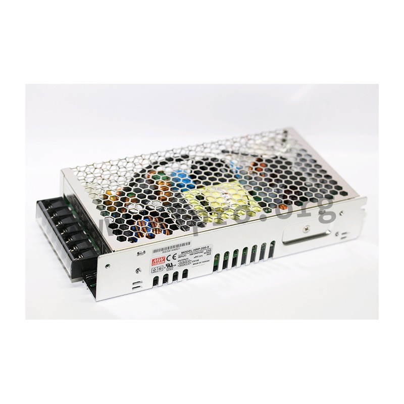 Switching power supplies in an enclosed housing with 200W, a universal input, a low profile and screw terminals. These devices have a built-in active PFC function and are protected against overload (auto recovery), overvoltage (300V AC / 5s) as well as short circuit. They have a built-in remote sense control and comply with UL/EN62368-1, EN55032 class B, EN61000-3-2 as well as EN61000-3-3. We offer the types HRP-200-3.3, HRP-200-5, HRP-200-7.5, HRP-200-12, HRP-200-15, HRP-200-24, HRP-200-36 and HRP-200-48 of this Mean Well series as well as the following power supplies with a low no-load power, a built-in remote ON/OFF control and a built-in auxiliary power (standby 5V/0,3A): HRPG-200-3.3, HRPG-200-5, HRPG-200-7.5, HRPG-200-12, HRPG-200-15, HRPG-200-24, HRPG-200-36 and HRPG-200-48.