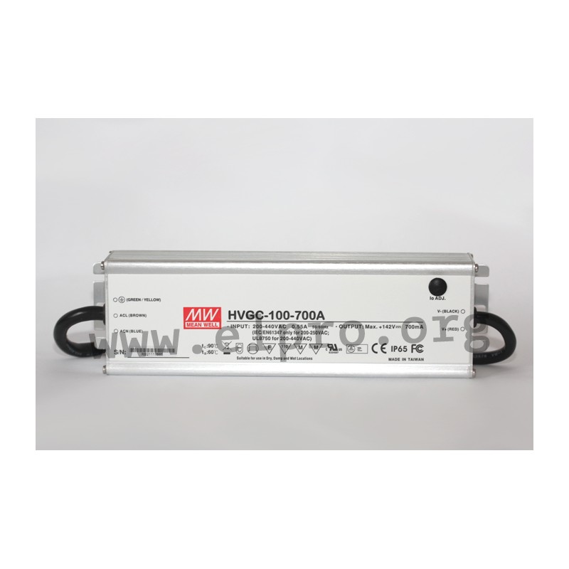 LED drivers in a metal housing (IP65) with a constant current and 100W. These devices are protected against overload (auto recovery), overtemperature, overvoltage as well as short circuit, comply with EN61347-1, EN61347-2-13, EN55015, EN61000-3-2 class C, EN61000-3-3 as well as EN61547 and are suitable for LED lighting applications. They have a built-in active PFC function as well as a built-in potentiometer for adjusting the current limitation. We offer the following types of this Mean Well series: HVGC-100-350A and HVGC-100-700A.