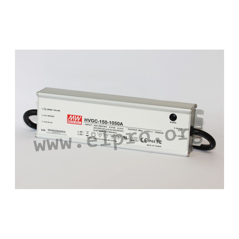 LED drivers in a metal housing (IP65) with a built-in potentiometer for adjusting the current limitation, a constant current and 150W. These devices comply with EN61347-1, EN61347-2-13, EN55015, EN61000-3-2 Class C, EN61000-3-3 as well as EN61547 and are protected against overload (auto recovery), overtemperature, short circuit as well as overvoltage. They have a built-in active PFC function and are suitable for LED lighting applications. We offer the following types of this Mean Well series: HVGC-150-350A, HVGC-150-500A, HVGC-100-700A, HVGC-150-1050A and HVGC-150-1400A.