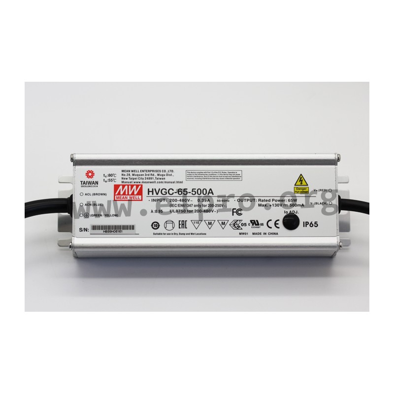 LED drivers EN61347-1, EN55015, EN61000-3-2 class C with active PFC function comply with EN61347-1, EN55015 and EN61000-3-2 class C and have a built-in active PFC function. Their output current is adjustable through a built-in potentiometer and they are suitable for LED lighting applications. We offer the following types of this Mean Well series: HVGC-65-350A, HVGC-65-500A, HVGC-65-700A and HVGC-65-1050A.