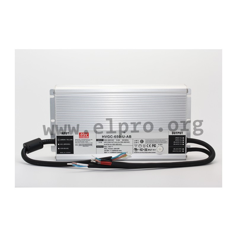 LED drivers in an aluminium housing (IP67) with a universal input, a constant power, a 3 in 1 dimming function (adjustable 0 to 10V DC, 10V PWM, potentiometer) and a surge immunity level of 8kV/4kV. These devices are suitable for LED lighting applications and comply with EN61000-3-2 class C as well as EN55015. They are protected against overload (auto recovery), overvoltage as well as short circuit and have a built-in active PFC function. We offer the following types of this Mean Well series: HVGC-650-L-AB, HVGC-650-M-AB, HVGC-650-H-AB and HVGC-650-U-AB.