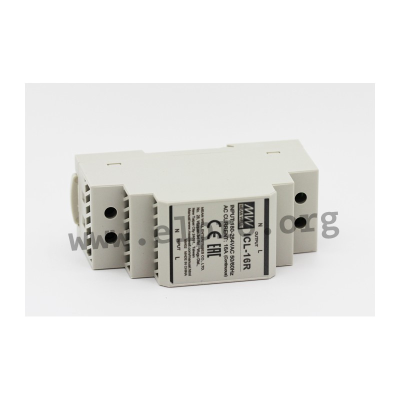 Current limiters for inrush current limiting, peak current limiting and R.M.S current limiting of up to 165A (20ms) and 16A with a voltage of 180 to 264V AC (continuous). These devices are suitable for handling capacitive loads (up to 2500µF) and enable an installation of multiple power supplies on the same AC line. They have an internal thermal protection as well as an integrated bypass relay. We offer the type ICL-16R for DIN-Rail mounting and the type ICL-16L for installation in terminal devices of this Mean Well series.