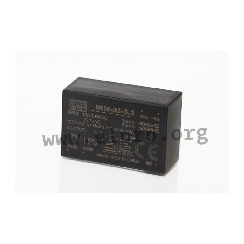 Switching power supplies in an enclosed housing (PCB) with 3W, insulation class II, a low no-load power and a universal input. These devices have a fanless design and are protected against overload, short circuit as well as overtemperature. They are suitable for PCB mounting and comply with EN55032 class B, EN61000-3-2, EN61000-3-3, EN60335-1 as well as UL/EN62368-1. We offer the following types of this Mean Well series: IRM-03-3.3, IRM-03-5, IRM-03-9, IRM-03-12, IRM-03-15 and IRM-03-24.