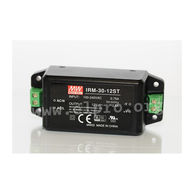 Switching power supplies in an enclosed housing with 30W, a universal input, screw terminals (IRM-30-_ST), a low no-load power and insulation class II. These devices are suitable for PCB mounting and are protected against overload, overvoltage as well as short circuit. They have a high efficiency and comply with UL/EN62368-1 sowie EN55032 class B. We offer the following types of this Mean Well series: IRM-30-5, IRM-30-12, IRM-30-15, IRM-30-24, IRM-30-48, IRM-30-5ST, IRM-30-12ST, IRM-30-15ST, IRM-30-24ST and IRM-30-48ST.