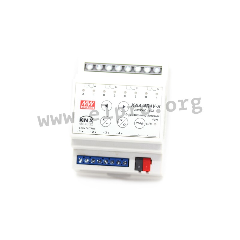 4 channel KNX LED actuators in a DIN rail housing (IP20) with 10A per channel, programmable time and scene functions and push buttons for manual control. These devices allow a regulation by a linear or a logarithmic curve and are suitable for automation and lighting/dimming applications. They are programmable with the standard software ETS and do not require an external power supply (supply voltage via KNX/EIB). We offer the types KAA-4R4V-10 as well as the actuators KAA-4R4V-10S with a secure function of this Mean Well series.