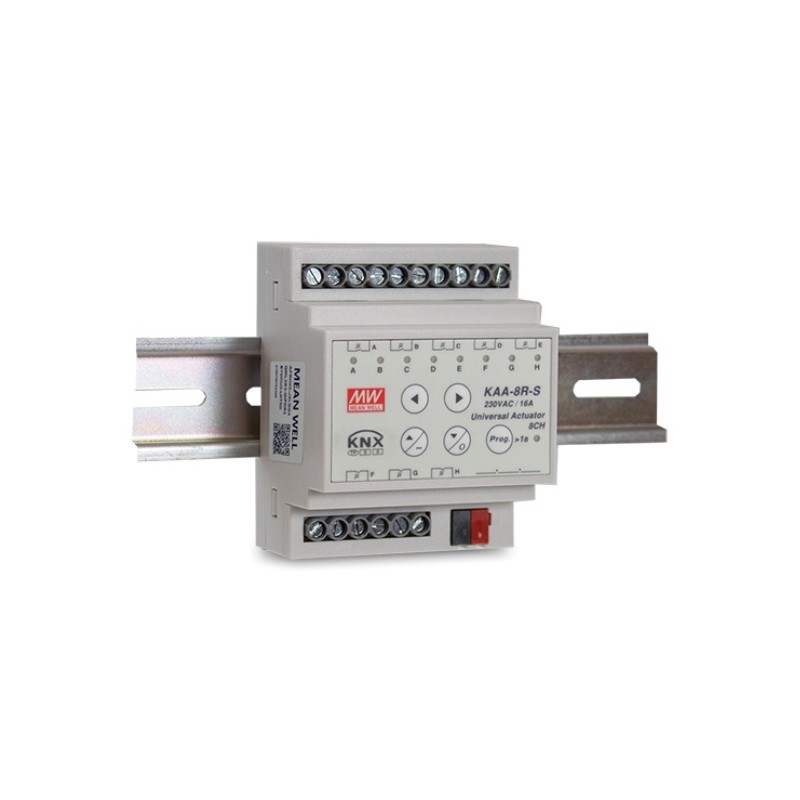 KNX universal actuators in a compact and enclosed a housing (IP20) with up to 8 channels for domotics applications like lighting switching, ventilation, planned shutter/blind and heating control. These actuators dont require an external power supply and can be mounted directly on a DIN rail. They are suitable for resistive, inductive or capacitive loads and have various programmable time and scene functions. Furthermore, they are programmable with the standard software ETS or manually through the push buttons. We offer the type KAA-8R of this Mean Well series as well as the actuators KAA-8R-16S and KAA-8R-10S with a data secure function.